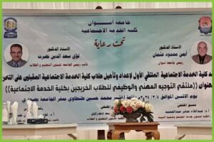 نظمت اليوم كلية الخدمة الإجتماعية جامعة أسوان الملتقي الاول لإعداد وتأهيل طلاب كلية الخدمة الإجتماعية للطلاب المقبلين علي التخرج، تحت عنوان “ملتقي التوجيه المهني والوظيفي للطلاب الخريجين بكلية الخدمة الإجتماعية” ويقام الملتقى تحت رعاية الاستاذ الدكتور أيمن محمود عثمان رئيس جامعة أسوان وبحضورالدكتور لؤي سعد الدين نصرت نائب رئيس الجامعة لشئون التعليم والطلاب، والدكتور محمد سيد دندراوي وكيل الكلية لشئون التعليم والطلاب والدكتور عبداللاه صابر منسق الملتقي ووكيل الكلية لخدمة المجتمع وتنمية البيئة،وبحضور الدكتور علي عباس دندراوي نائب رئيس الجامعة السابق وضيوف الملتقي من ومديريه التضامن الاجتماعى وهيئة محو الأمية وتعليم الكبار وبمشاركة ا.سيدة شحات المدير التنفيذي للمؤسسه العربية الأفريقية للأبحاث والتنمية المستدامة بأسوان وأ.اسماء اسماعيل المسئول الفنى لقسم التأهيل بالمؤسسة العربية الافريقية للأبحاث والتنمية المستدامة بأسوان وا.اسراء مصطفى مسئول العلاقات العامة بالمؤسسة العربية الافريقية للأبحاث والتنمية المستدامة بأسوان وبحضورعدد من الجمعيات والمؤسسات المجتمعية مثل مؤسسة حياه كريمة وجمعية المستثمرين ومؤسسة جنوبية حرة ومؤسسة كلنا ايد واحدة وأعضاء هيئة التدريس ومعاونيهم وطلاب الكلية وقدم فقرات الملتقى الدكتور ايهاب محمد احمد.